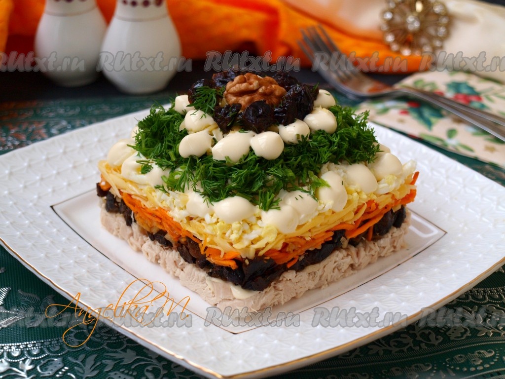 Эффектный и очень вкусный салат "Марсель", приготовленный с черносливом и корейской морковкой, станет украшением праздничного стола.