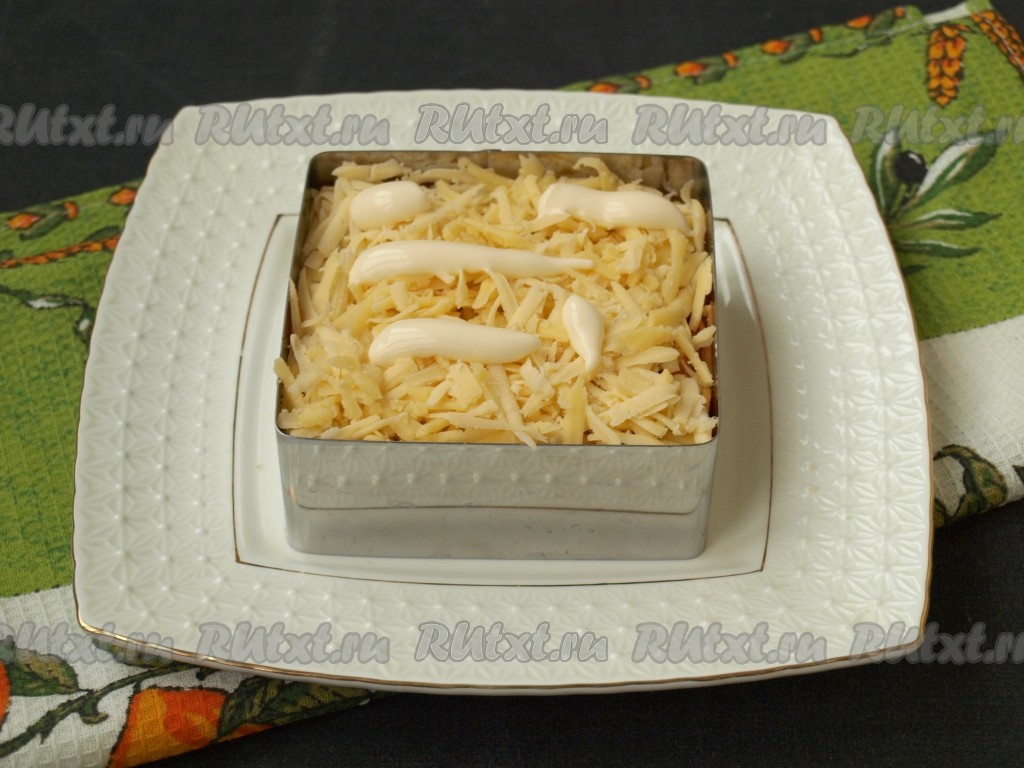 Натереть на крупной тёрке твёрдый сыр, выложить его сверху моркови. Смазать сыр майонезом.