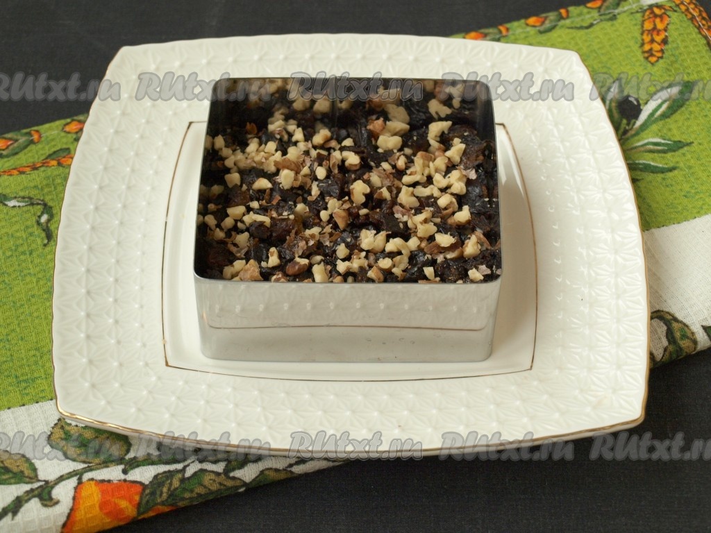 Чернослив промыть тёплой водой. Если чернослив суховат, его нужно переложить в небольшую ёмкость, залить кипятком, оставить минут на 5, затем слить лишнюю воду. Обсушить промытый (или запаренный) чернослив, выложив его на бумажное полотенце. Немного чернослива отложите для украшения салата. Нарезать оставшийся чернослив на небольшие кубики, равномерно разложить поверх филе. Порубить ножом грецкие орехи (2-3 ядра грецких орехов отложите для украшения) и посыпать хаотично сверху чернослива. Можно также перемешать орехи с черносливом. Этот слой можно смазывать майонезом, а можно и так оставить.