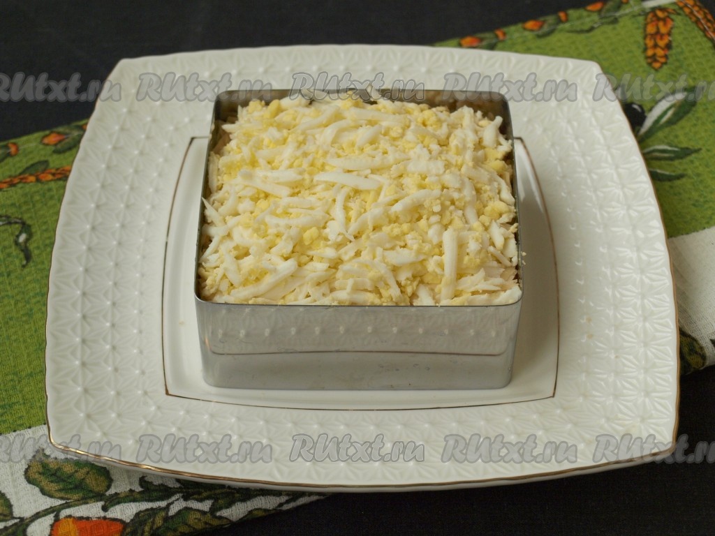 Натереть на тёрке варёные яйца и выложить их сверху сыра. Яйца также смазать майонезом.