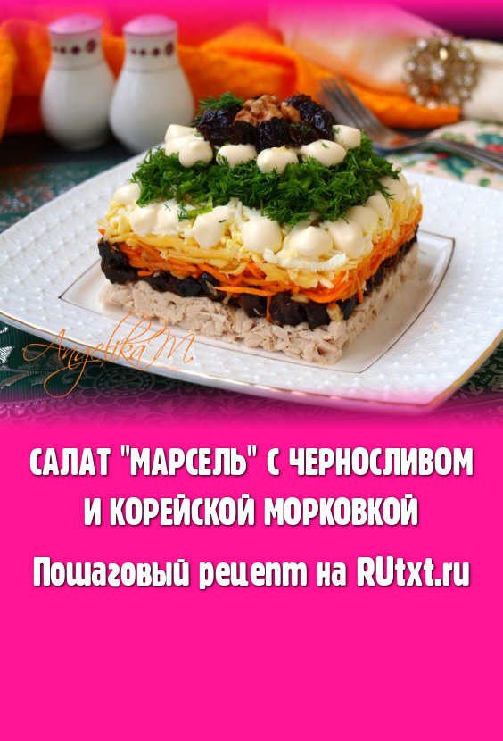 Предлагаю вам рецепт очень вкусного и оригинального салата "Марсель", который готовится с черносливом и корейской морковкой. Блюдо выглядит эффектно, поэтому оно отлично подходит для праздничного стола. Чернослив добавляет салату пикантные, слегка сладковатые нотки, а корейская морковка делает вкус более ярким. Уверена, этот красивый, вкусный салат понравится и вам, и вашим близким, и гостям!