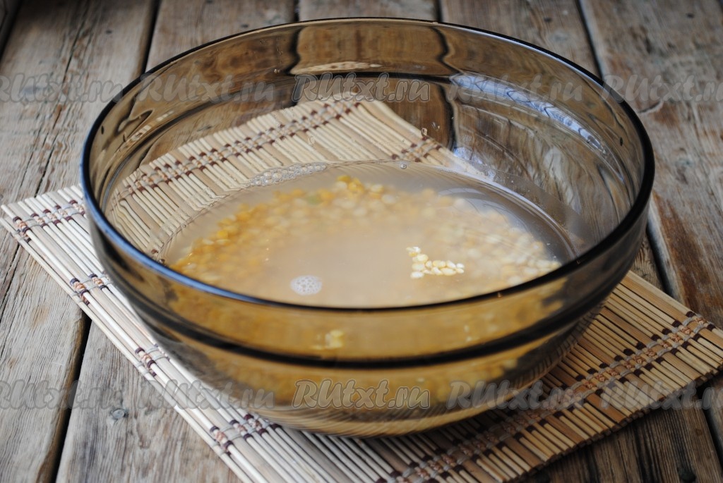 Горох вымыть, залить холодной водой и оставить на ночь или на пару часов. Затем воду слить, горох поместить в кастрюлю, залить 3 стаканами чистой воды, отправить на огонь, довести до кипения и варить на небольшом огне до готовности (у меня горох варился 1 час, но продолжительность варки зависит от сорта гороха).
