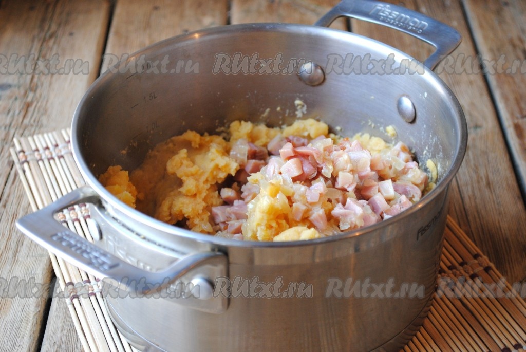 Копчёное мясо нарезать кубиками, выложить к обжаренному луку, перемешать и готовить ещё 2 минуты, помешивая.
