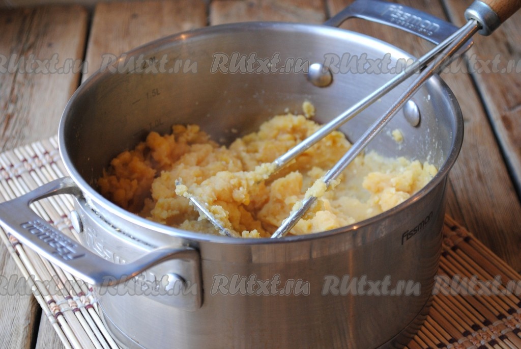 Толкушкой подавить горох, чтобы получилась более однородная масса.