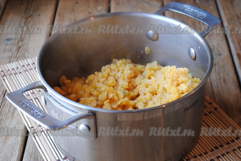 Когда горох будет мягким, а вся вода испарится, снять кастрюлю с огня.