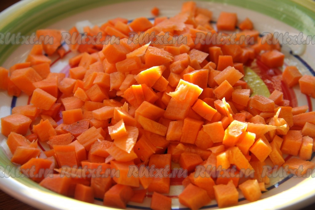 К обжаренному луку и свинине добавить очищенную и нарезанную кубиками морковь, обжарить, иногда помешивая, до золотистого цвета морковки (на это потребуется минут 10). Не забывайте в процессе обжаривания время от времени перемешивать мясо и овощи, чтобы они не подгорели.