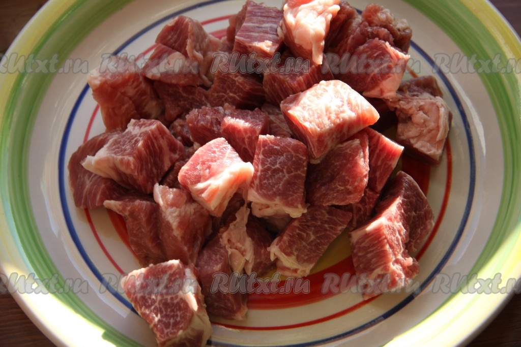 Свинину нарезать на небольшие кубики, посолить и обжарить на сильном огне, периодически перемешивая, в казане с добавлением растительного масла. Не следует сильно обжаривать мясо, достаточно, чтобы оно подрумянилось с боков (на это уйдёт 5-7 минут).