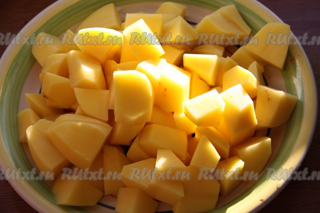 По истечении времени к овощам и свинине добавить нарезанный кубиками очищенный картофель, соль и специи. Без добавления воды продолжать готовить, иногда помешивая, до полуготовности картошки (10 минут). Картофель должен получиться со слегка поджаренной корочкой.