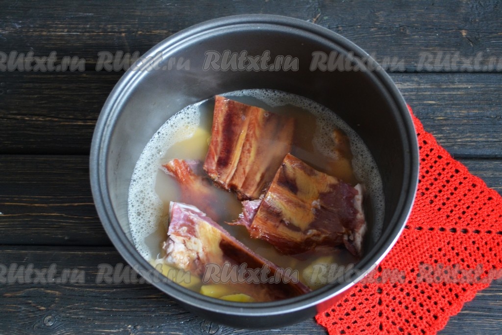 Сразу же выложить и копченые ребрышки, нарезанные на небольшие порционные части. Вместо ребрышек можно использовать и другие копчености, например, колбасу. Закрыв крышку мультиварки, включить режим "Суп" ещё на 20 минут.