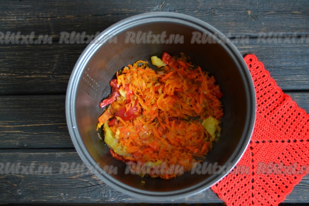 В чашу мультиварки влить растительное масло и прогреть его 1-2 минуты. Очистить и натереть морковь. Лук очистить и нарезать мелкими кубиками. Из перца удалить семена и плодоножку. Выложить морковь, лук и перец в чашу мультиварки и обжарить 2-3 минуты на режиме "Жарка", периодически помешивая. Овощи должны стать мягкими. Обжаренные овощи переложить из чаши мультиварки в мисочку.