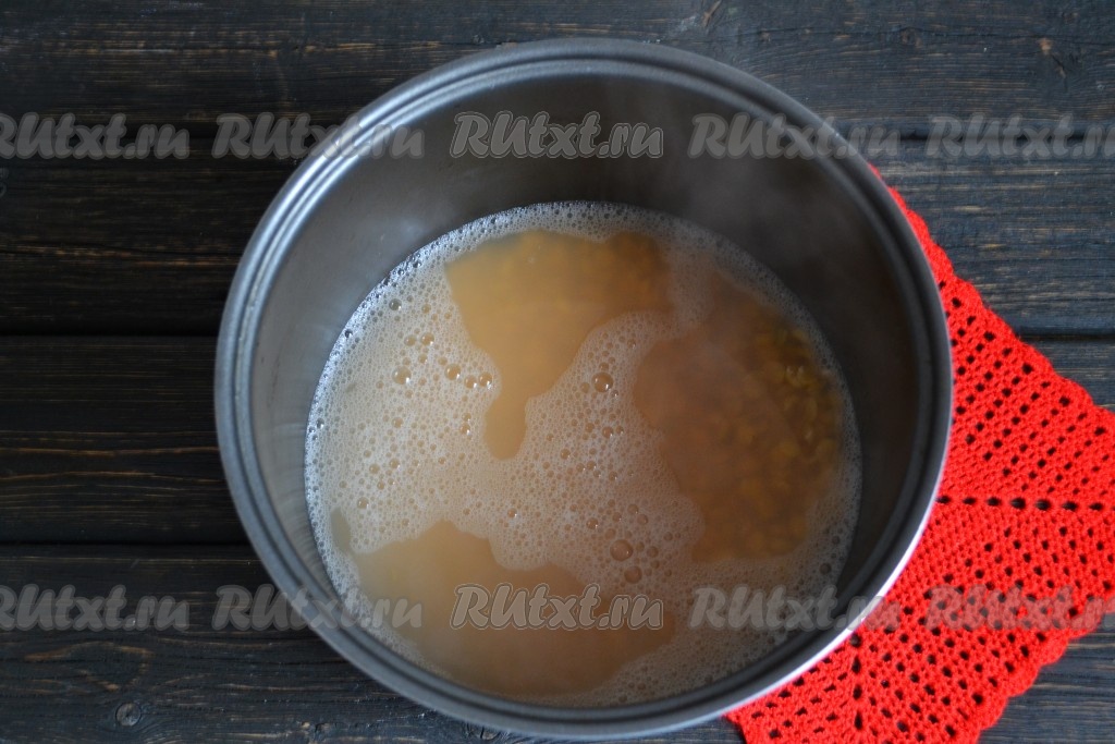 Горох перебрать от плохих зерен и мусора. Промыть горох холодной водой (это удобно делать в дуршлаге). Затем залить горох горячей водой и оставить на час, затем воду слить. Горох выложить в чашу мультиварки и залить 2 литрами чистой кипяченой воды. Крышку мультиварки закрыть, включить режим "Суп" на 1 час.