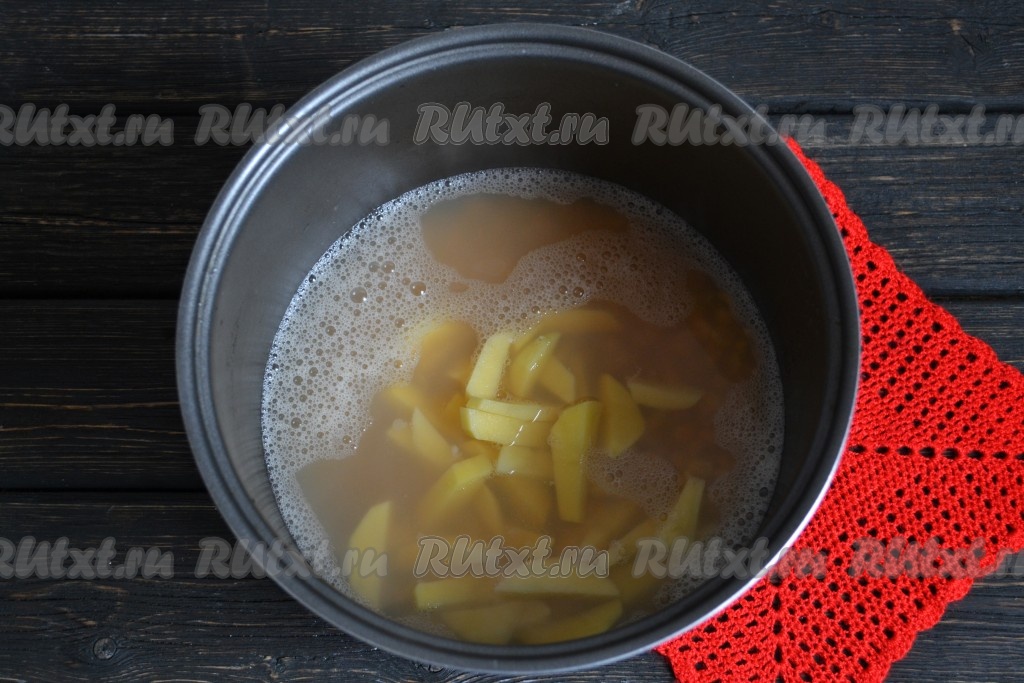 Когда мультиварка даст сигнал, что прошел час, к гороху добавить картофель.