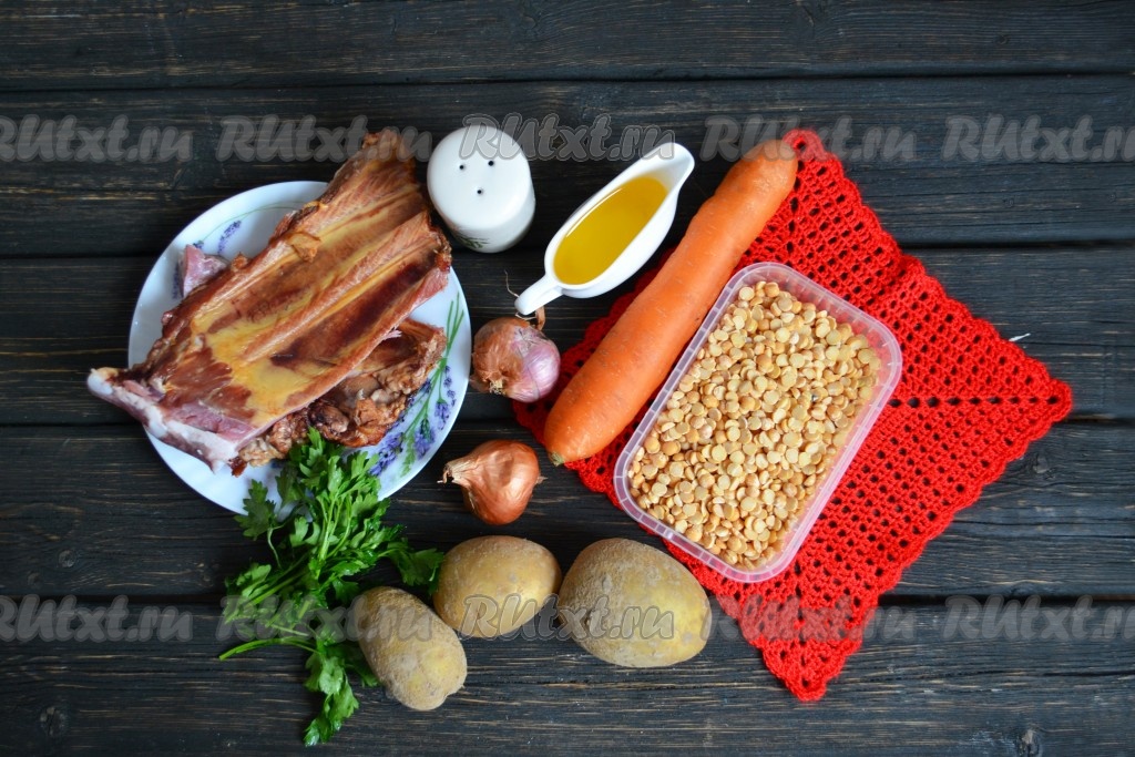 Подготовить необходимые ингредиенты для приготовления горохового супа с копчеными ребрышками в мультиварке