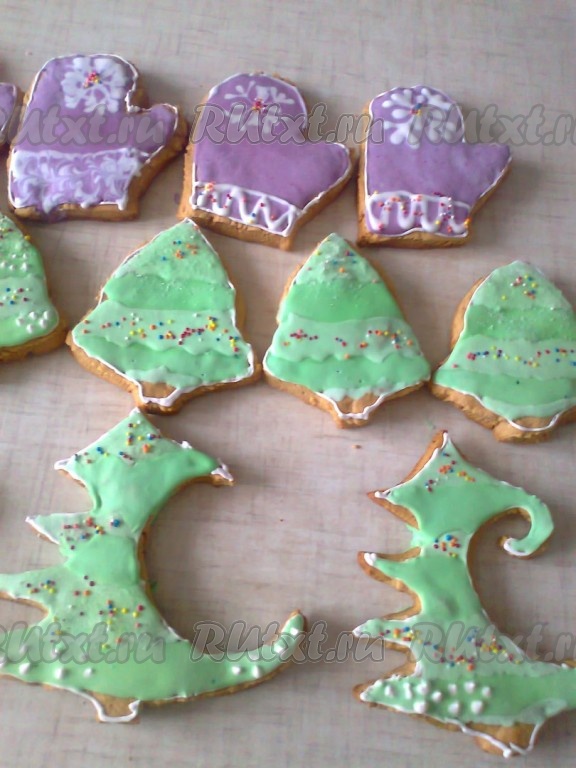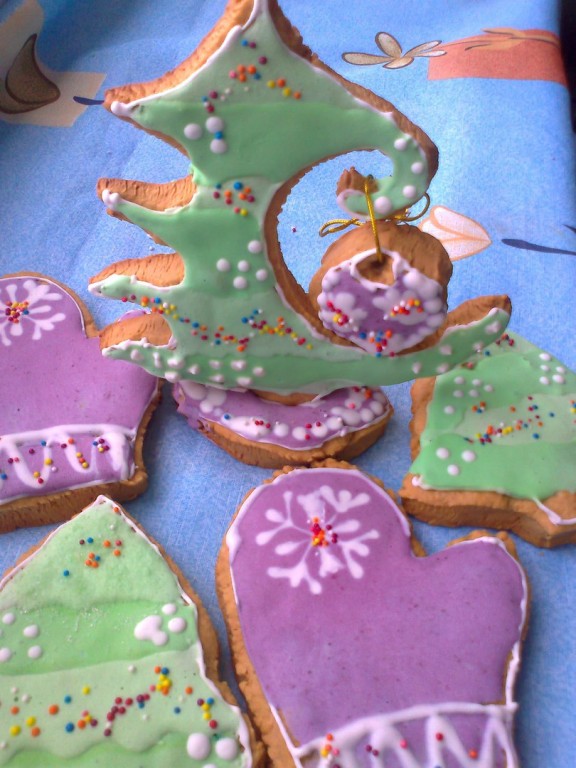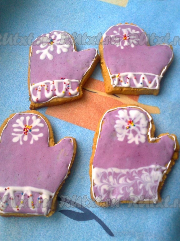 а пряники с сиреневой глазурью в форме варежек украсила узором из белой глазури.