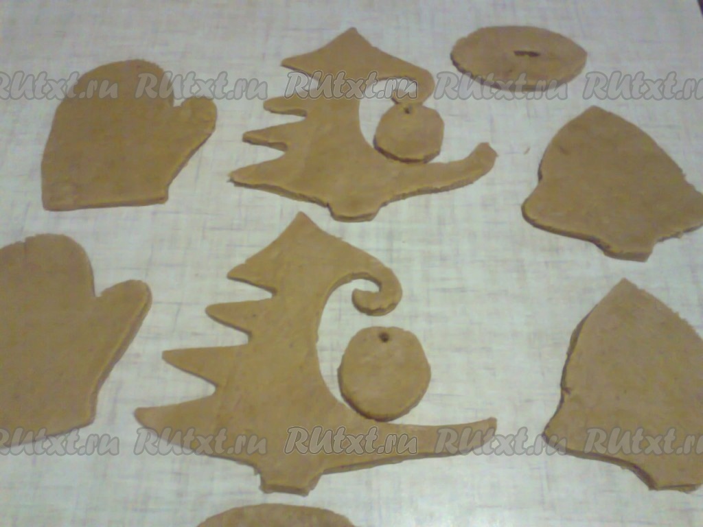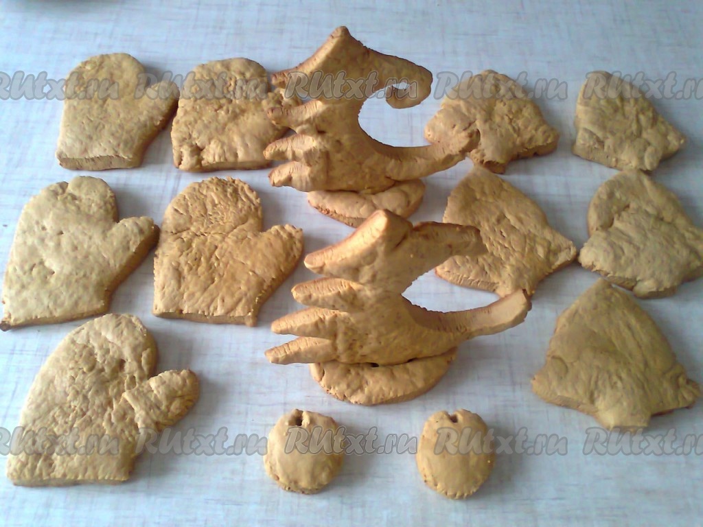 Делим тесто на несколько частей, раскатываем до толщины 5-7 мм и вырезаем различные фигурки выемками для теста. Можно вырезать трафарет из картона.