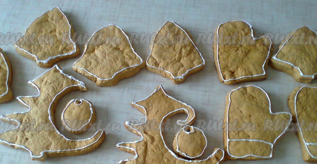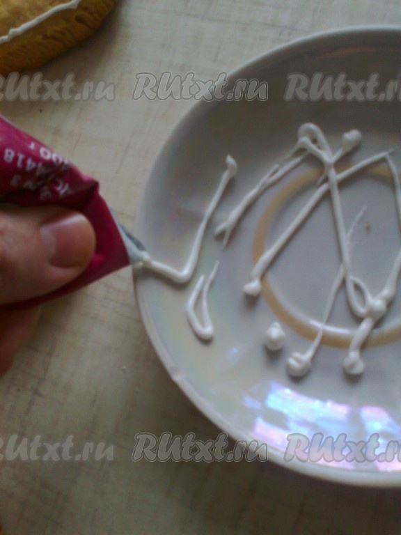 Глазурь кладем в пакетик (я использовала пакетик от сметаны, сделав отверстие зубочисткой), в уголке которого проделывается маленькое отверстие. Глазурью через отверстие в пакетике и наносится контур или узор рисунка на пряники.