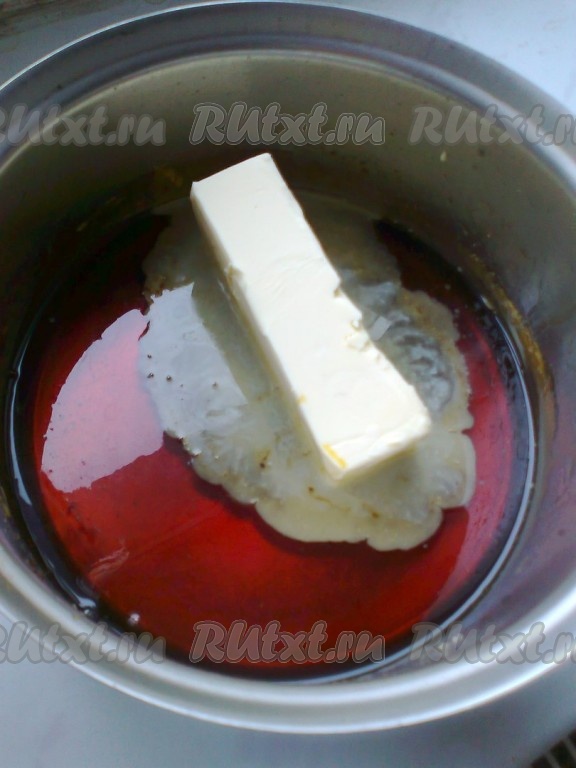 Снимаем сковородку с огня, добавляем 150 грамм сливочного масла (или 200 грамм маргарина), перемешиваем до растворения масла или маргарина.