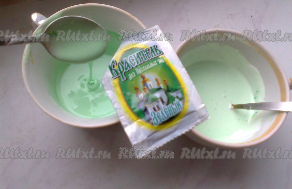 Для приготовления цветной глазури, сначала в розетку кладется растворенный в капле столового уксуса пищевой краситель (или сок свеклы, моркови), затем добавляется основа и необходимое количество воды. Для сиреневого цвета я использовала 1 чайную ложку сока черники, а для зеленого - щепотку зеленого пищевого красителя, разведенного в 0,5 чайной ложке 9% уксуса.