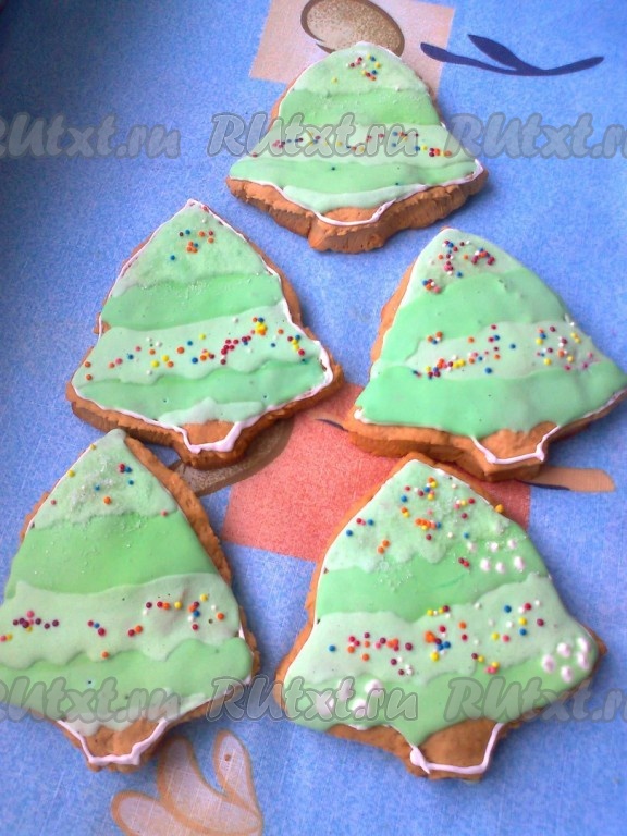 Пряники в форме елочки с зеленой глазурью украсила еще и цветной посыпкой,