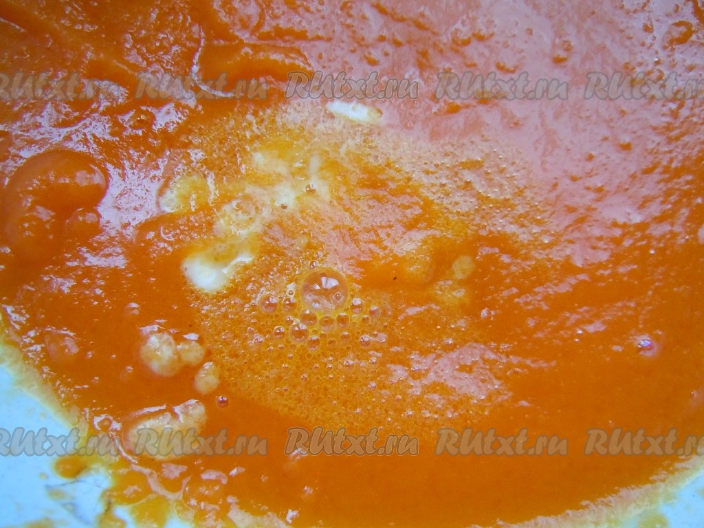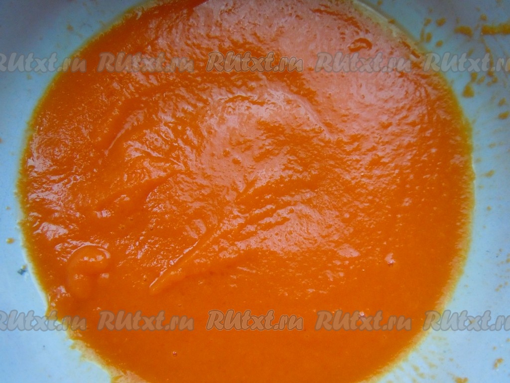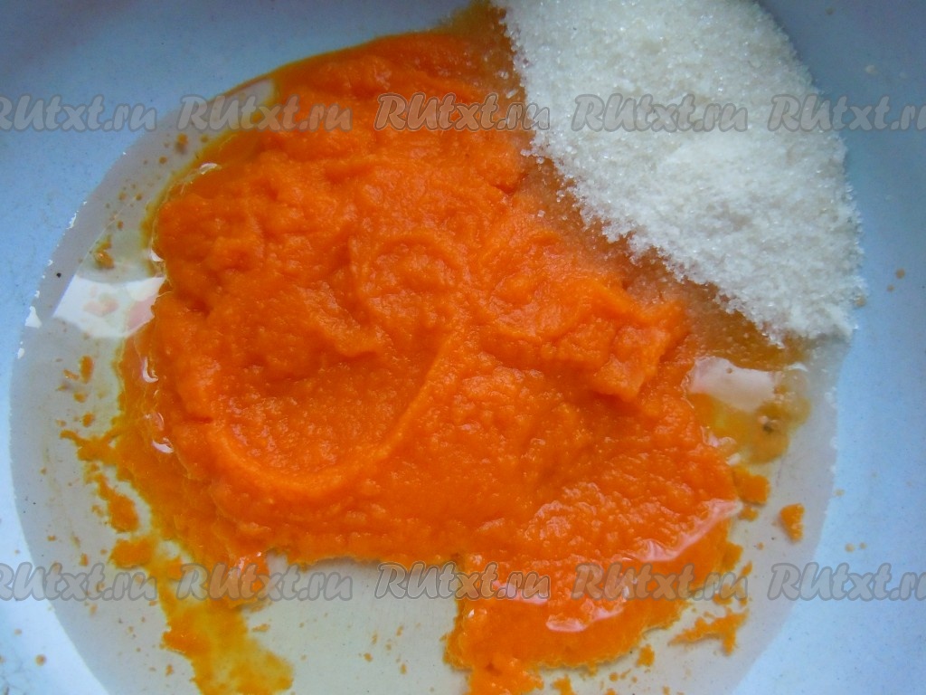 В другой большой миске смешать тыквенное пюре, масло и сахар. Тщательно перемешать.