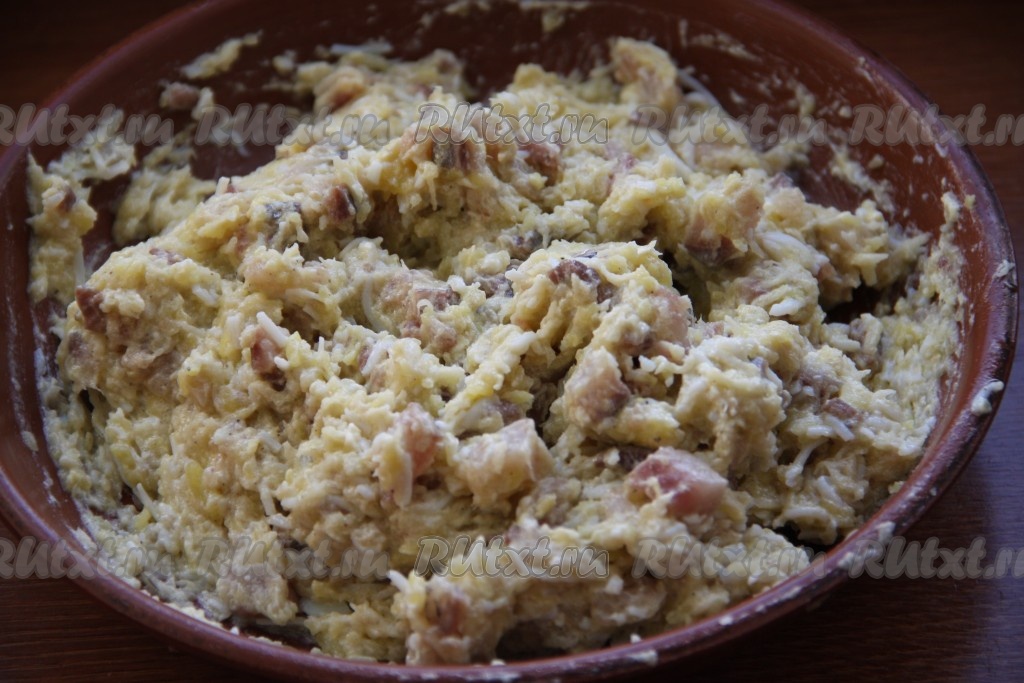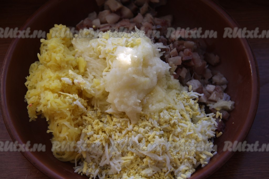 Очищенные лук и яблоко тоже натереть на мелкой терке и добавить к основной массе.