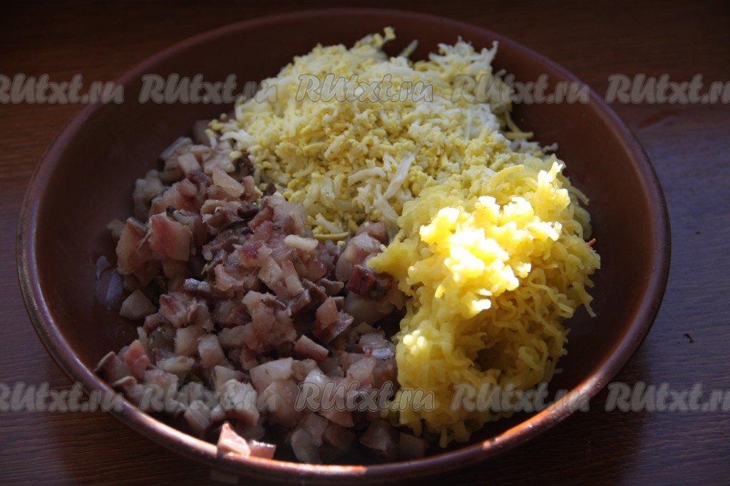 Яйца, сваренные вкрутую, и вареную картофелину очистить, натереть на мелкой тёрке и добавить к сельди.