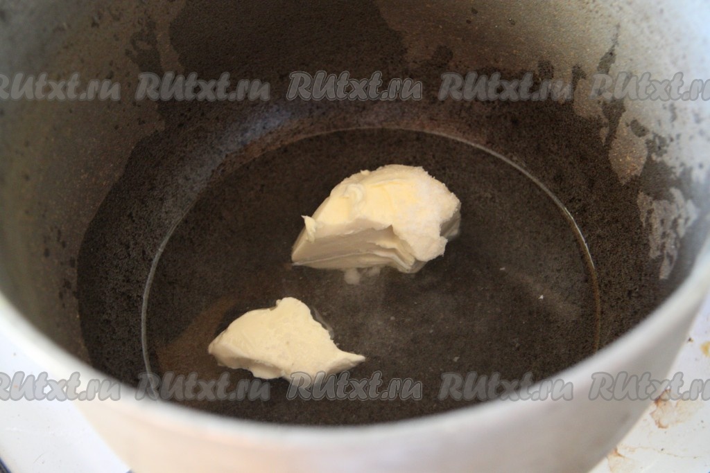 Для приготовления клецек в казанок (можно взять толстостенную кастрюлю или сковороду) добавить воду и сливочное масло, довести до кипения.