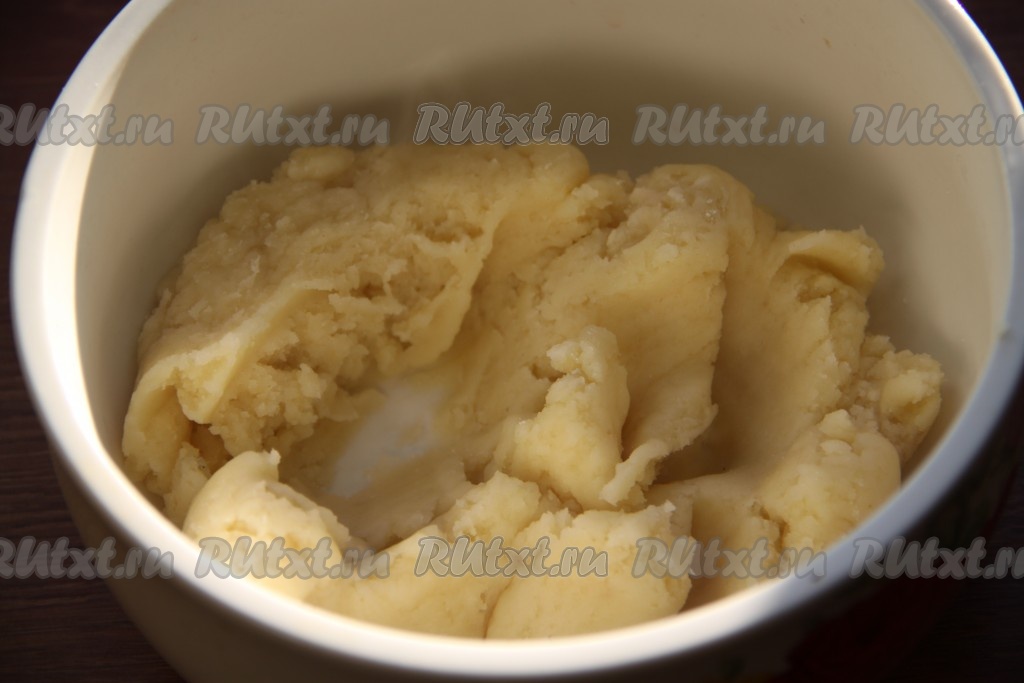 В получившуюся заваренную массу добавить одно яйцо и взбить миксером. Далее добавить мелко рубленную зелень и еще одно яйцо, взбить до получения однородной и пластичной массы.