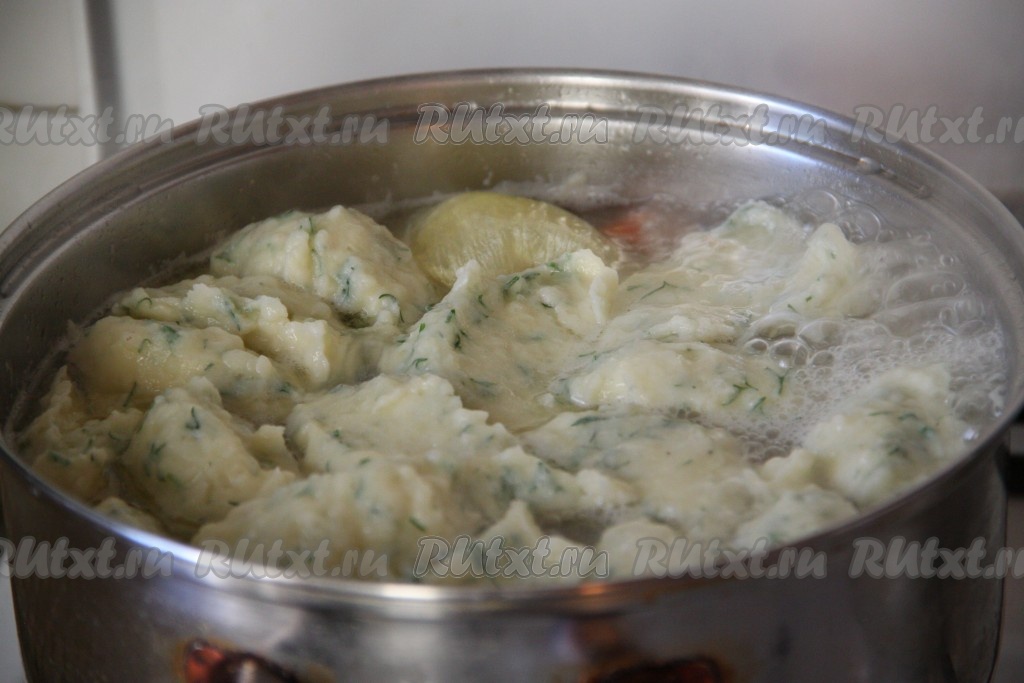 Когда картофель будет готов, набирая ложкой получившееся тесто, опускать его в суп с фасолью. Варить суп с клецками на небольшом огне под крышкой минут 10. В конце добавить зелень, соль, перец и лавровый лист по вкусу. Довести до кипения и выключить.
