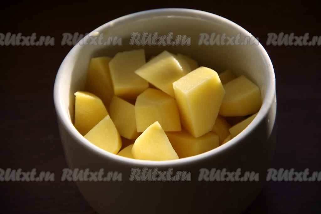 Картофель нарезать кубиками и отправить в бульон с готовой фасолью. Варить до готовности картошки, 15-20 минут.