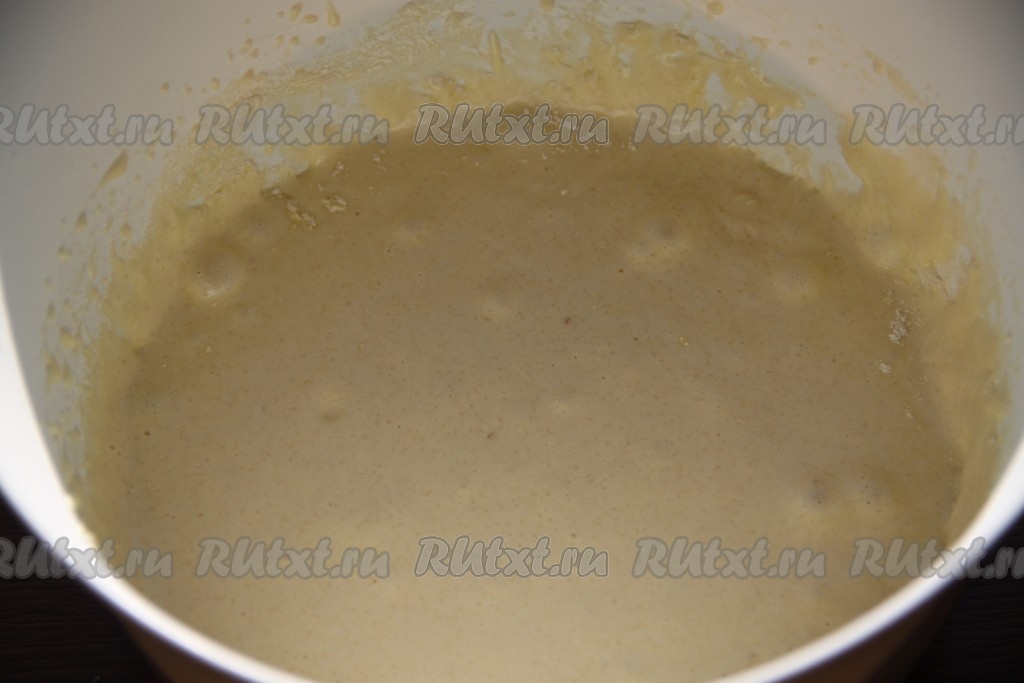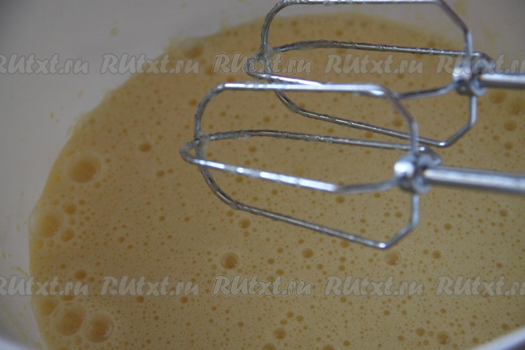 Яйца взбить с сахаром, масса должна посветлеть и стать пышной.