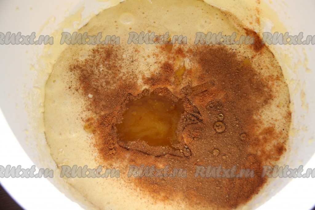 Добавить мед, мускатный орех, имбирь, разрыхлитель и корицу, все перемешать, получится тесто, напоминающее густую сметану.