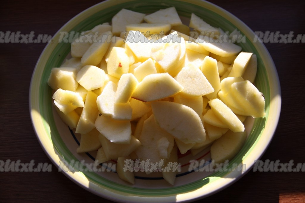 В форму диаметром 24-26 см выложить нарезанные яблоки (если форма не силиконовая, её лучше смазать маслом или застелить бумагой для выпечки).