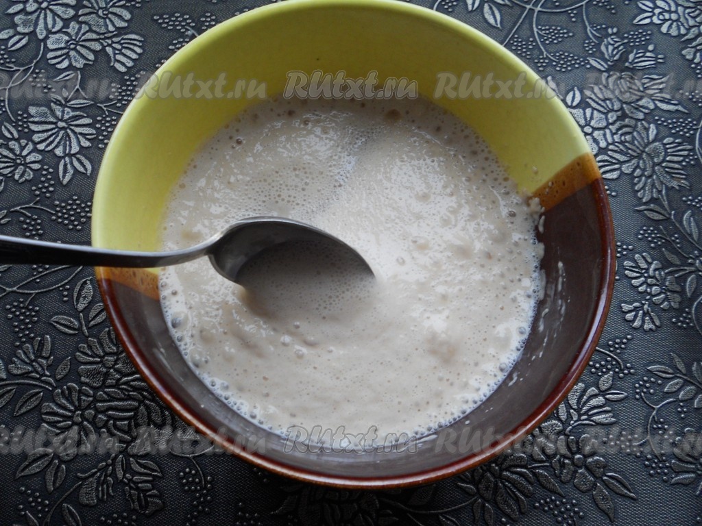 Прикрыть посуду с дрожжевой смесью пищевой пленкой и оставить в теплом месте на 10-15 минут. Дрожжи должны "ожить" (пениться).