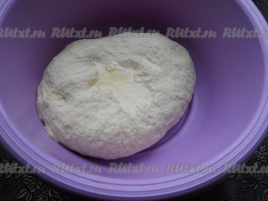Тесто нужно вымесить так, чтобы оно не липло к рукам и поверхности, но осталось мягким. Затем, добавляя по 1 столовой ложке растительного масла, вмешивать его в тесто. Тесто будет очень нежным и совсем не липнущим.