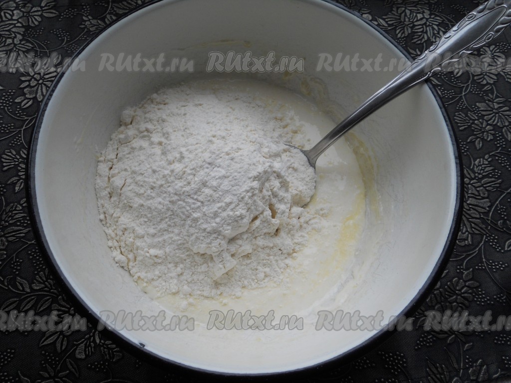 В эту смесь просеять большую часть муки.