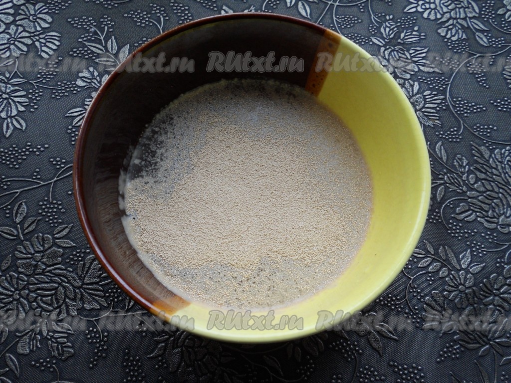В теплую воду всыпать дрожжи и сахар (для несладкой выпечки - 0,5 чайной ложки сахара, для сладкой - 2 чайные ложки сахара), перемешать.
