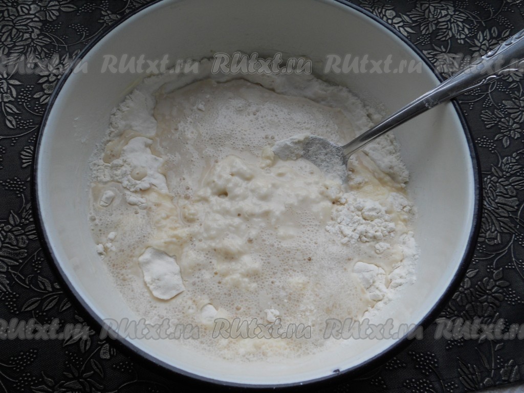 Также влить дрожжевую смесь, чуть смешать с мукой, а затем со сметанной смесью. Далее, добавляя оставшуюся муку, замесить тесто.