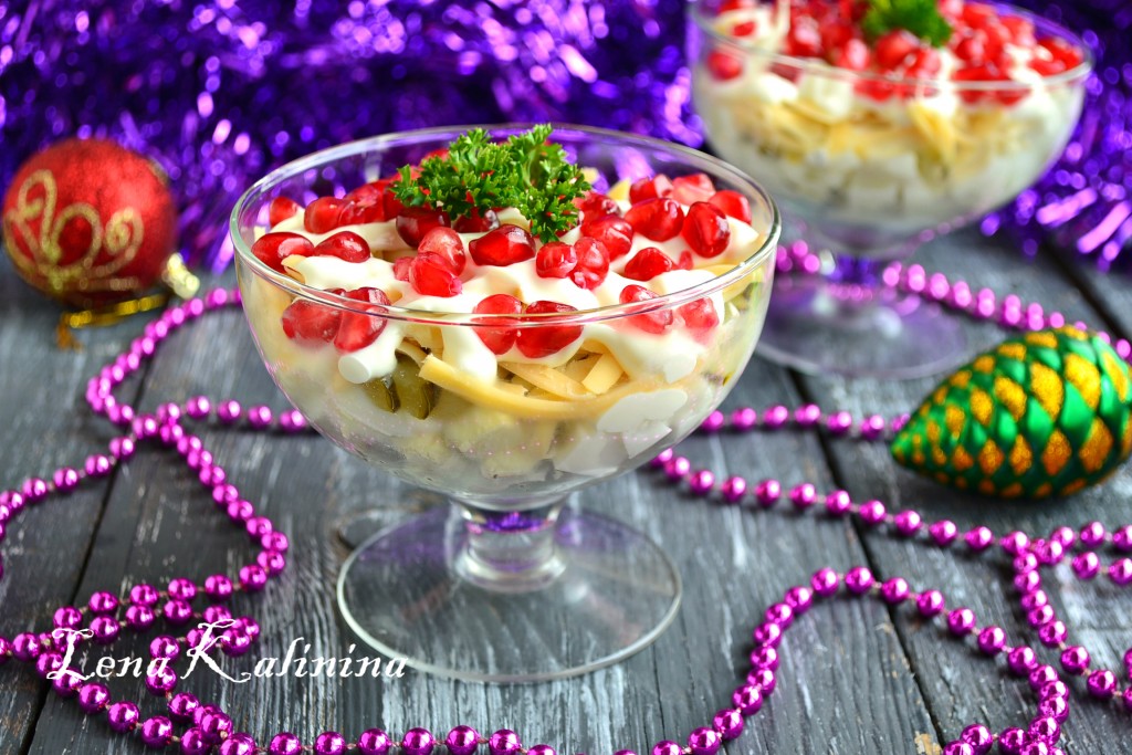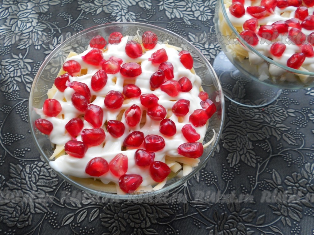 Украсить салат сверху слоем зерен граната.