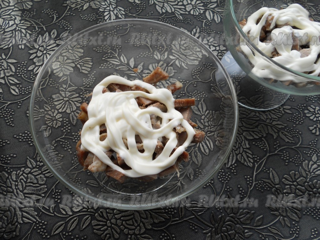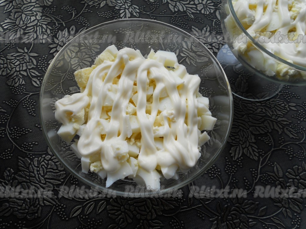 Следующий слой - рубленные вареные яйца + майонез.
