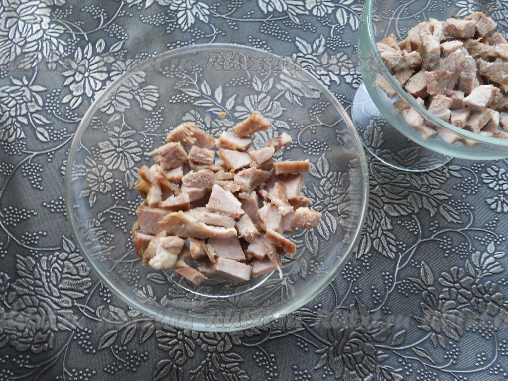 Мясо нарезать небольшими кусочками и выложить первым слоем, чуть посолить и поперчить (по желанию).
