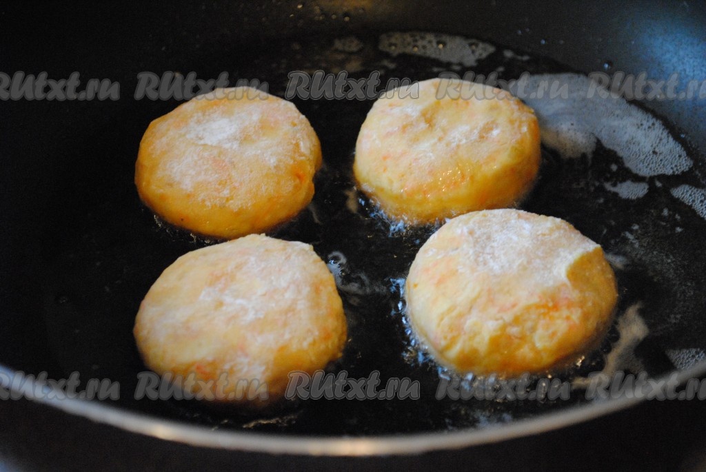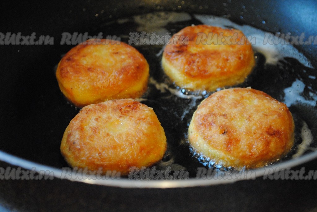 Мокрыми руками сформировать круглые котлеты. Запанировать их в муке и отправить на разогретую сковороду с растительным маслом.