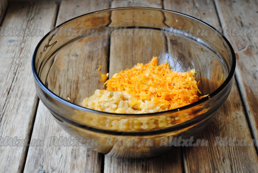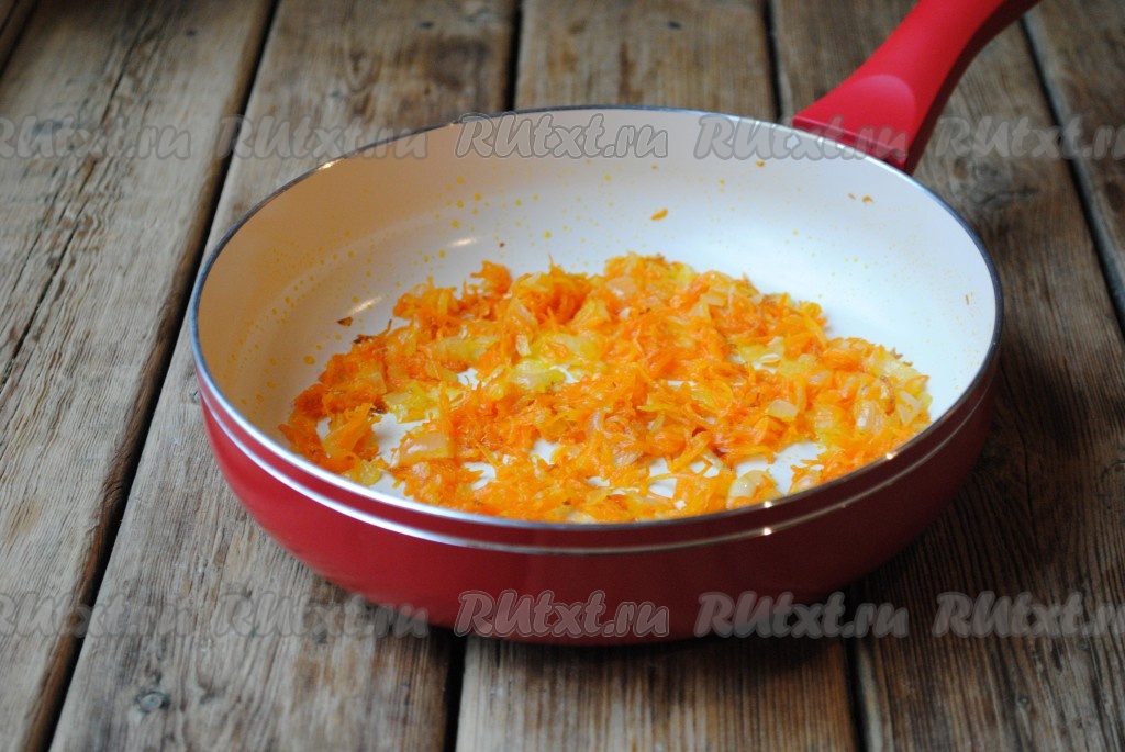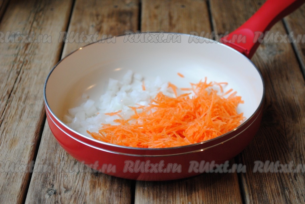 Горох вымыть, залить чистой водой и оставить на ночь. Затем воду слить, горох поместить в кастрюлю, залить 3 стаканами чистой воды, варить до готовности на небольшом огне (у меня горох варился 1 час, но продолжительность варки зависит от сорта гороха). Лук и морковь очистить, лук нарезать кубиками, морковь натереть на тёрке. Обжарить морковь с луком на небольшом количестве растительного масла до золотистого цвета.