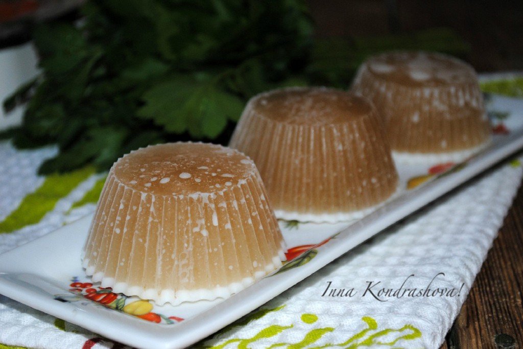 Холодцу из говядины и свиных ножек дать остыть при комнатной температуре, затем убрать в холодильник до полного застывания. Подавать этот вкусный домашний холодец лучше всего с горчицей или хреном.