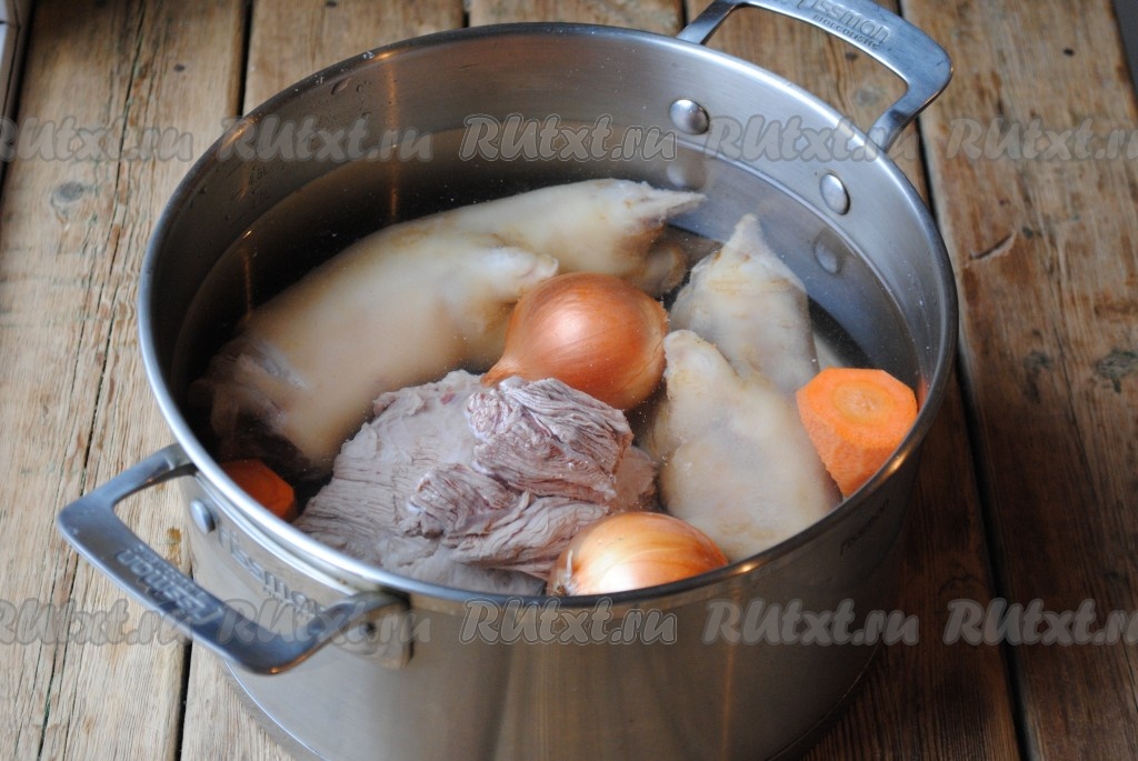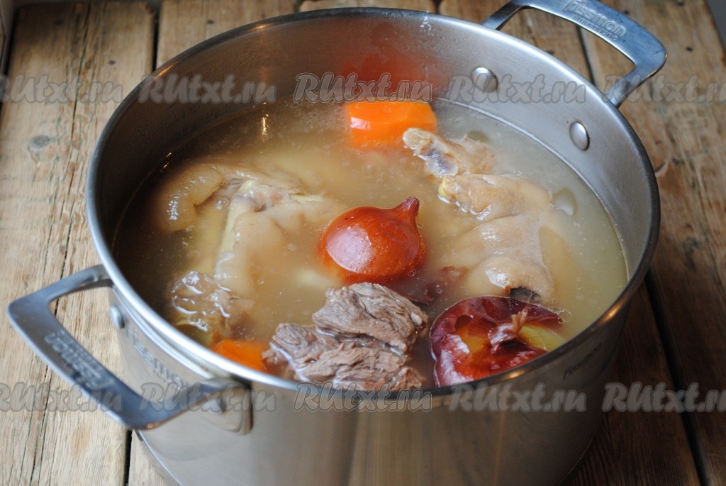 Мякоть говядины и свиные ножки вымыть, выложить в кастрюлю и залить чистой водой так, чтобы она полностью покрывала мясо, отправить кастрюлю на огонь. Когда вода закипит, на поверхности появится сероватая пена, эту воду надо будет вылить. Мясо ещё раз хорошо вымыть, снова выложить в кастрюлю, залить 3 литрами чистой воды.