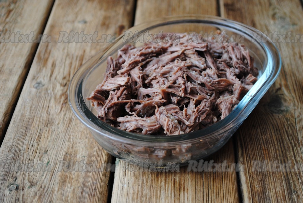 Мякоть говядины разобрать на волокна и добавить к уже нарезанному мясу.