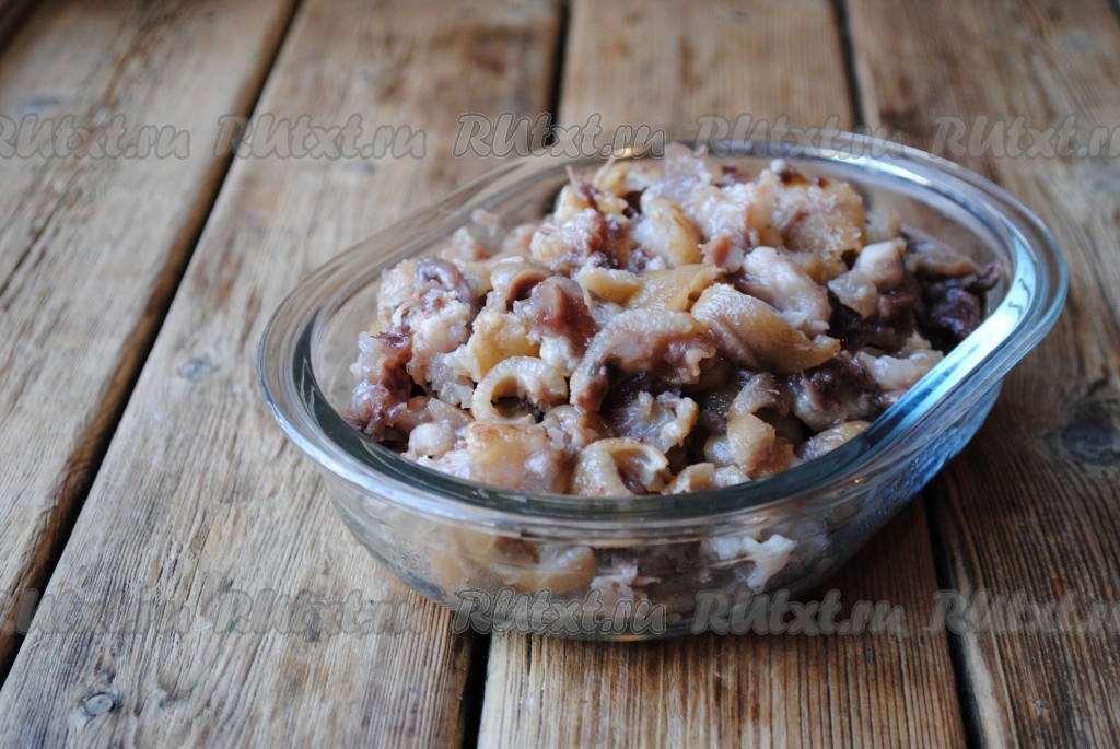 Из свиных ножек убрать все косточки, мясо вместе с кожицей мелко нарезать ножом.