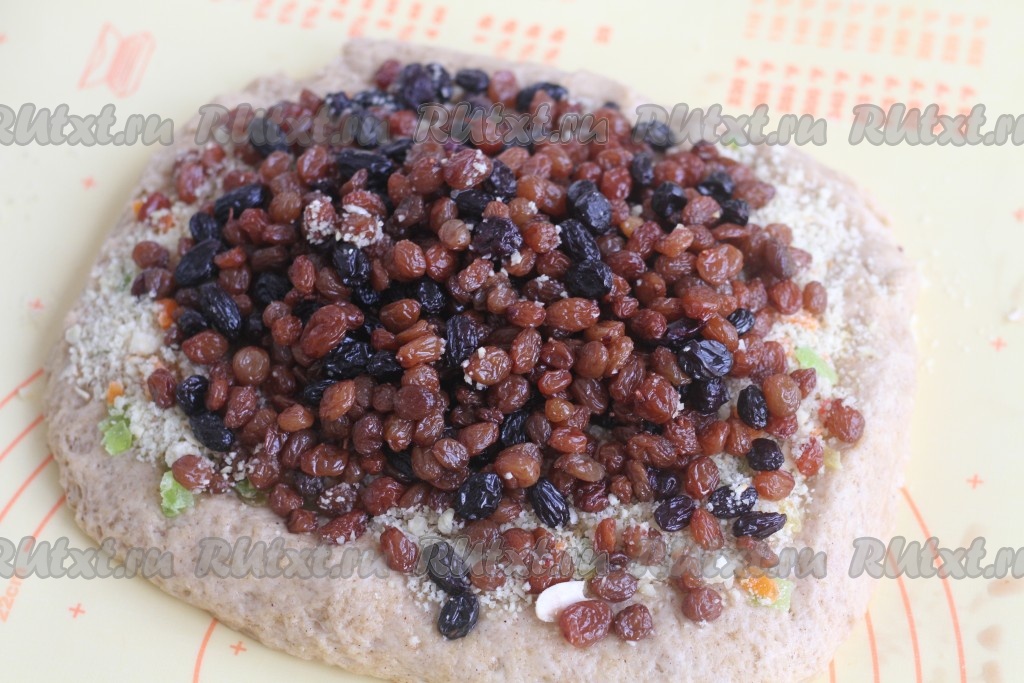 Подошедшее тесто обмять на столе, придать ему руками прямоугольную форму, выложить в середину цукаты, изюм, орехи, завернуть края теста. Аккуратно помесить тесто, чтобы вся начинка равномерно распределилась.