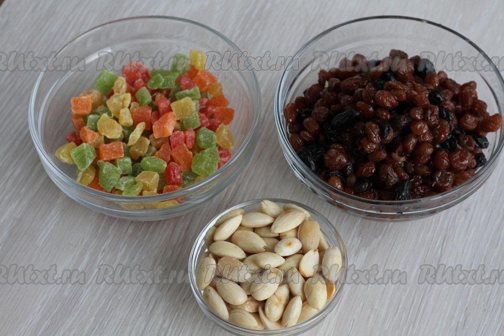Цукаты нарезать ножом, орехи порубить, с изюма слить жидкость.