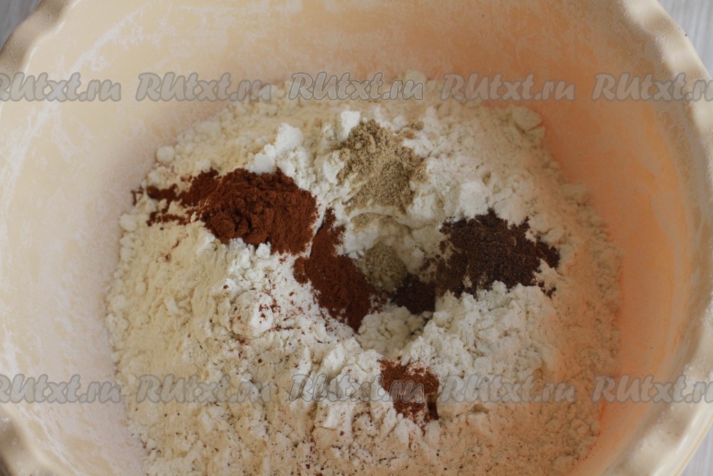 Муку просеять, добавить щепотку соли, пряности, все размешать.